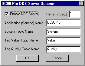 In this dialog box, check the Enable DDE Server check box and set the update (Refresh) time as desired. Leave the other settings as shown (default values). Click on OK to save the settings. Once you have done this, you should exit the DC90 Pro program and re-run the program for the settings to take effect. Start the DC90 Pro data collection.